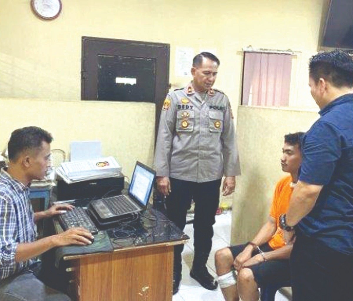 Dari foto yang diterima, pelaku nampak duduk di kursi plastik sambil diperiksa penyidik. Kaki kiri dan kanan pelaku masih dibalut perban berwarna putih.