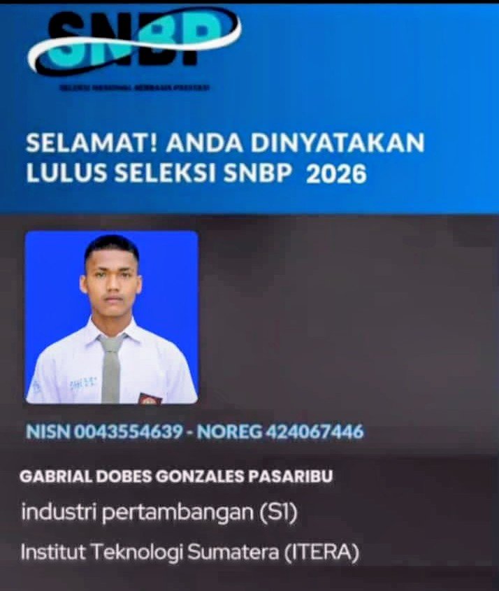 Ia adalah Gabrial Dobes Gonzales Pasaribu, siswa dari SMK HKBP Sibolga, yang dinyatakan lulus dan diterima pada program studi Industri Pertambangan (S1) di Institut Teknologi Sumatera (ITERA).