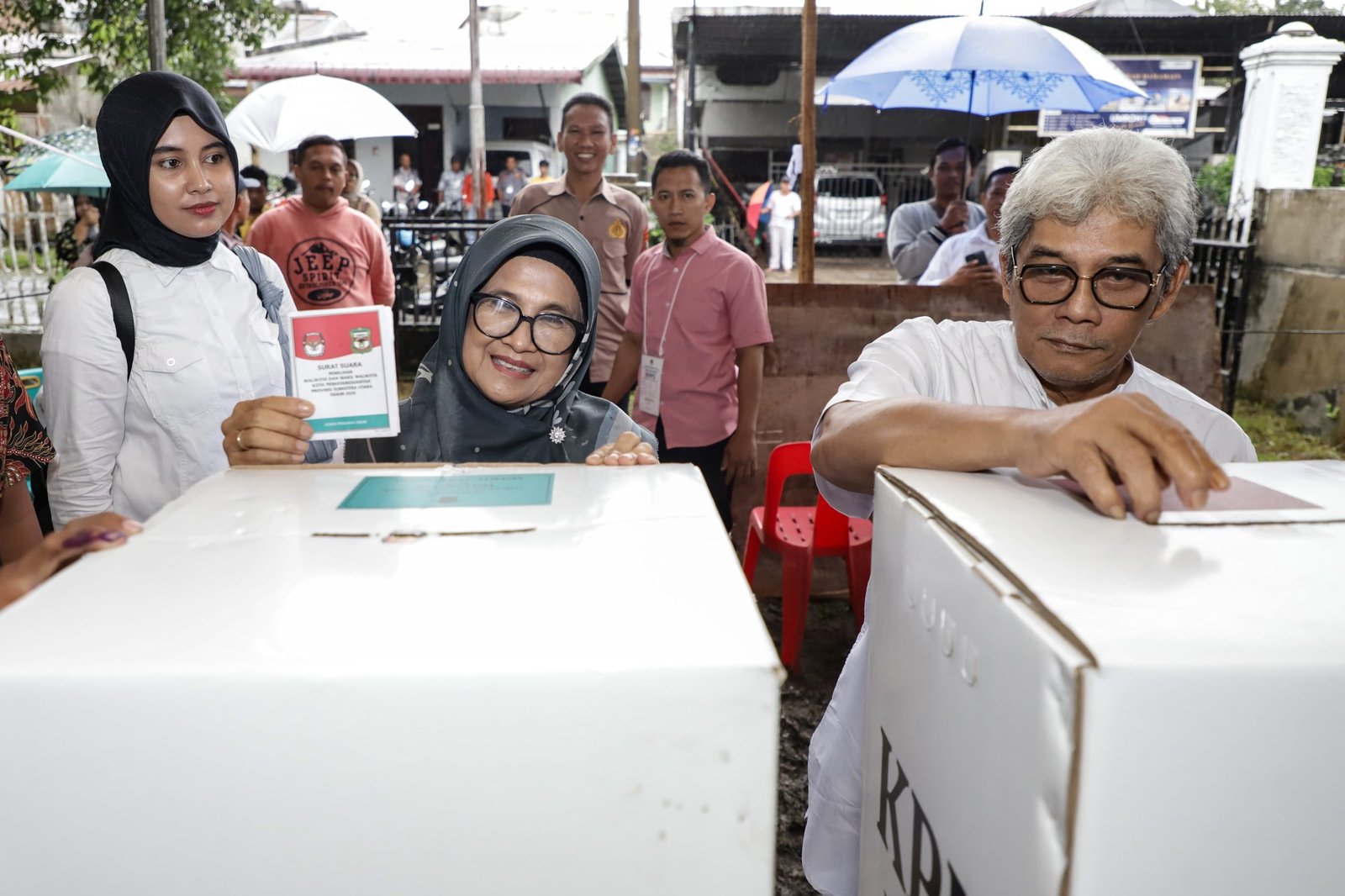 Wali Kota Pematangsiantar dr Susanti Dewayani Sp.A bersama Ketua Dekranasda H Kusma Erizal Ginting SH telah memberikan hak suara di Pilkada Serentak Tahun 2024. Keduanya menggunakan hak pilih di Tempat Pemungutan Suara (TPS) 04 Jalan Nusa Indah Kelurahan Simarito Kecamatan Siantar Barat, Rabu (27/11/2204) sekitar pukul 10.00 WIB. TPS tersebut tepat berada di samping kiri kediaman pribadi dr Susanti dan keluarga. Sehingga dr Susanti cukup berjalan kaki ke TPS dengan berpayung karena cuaca hujan.